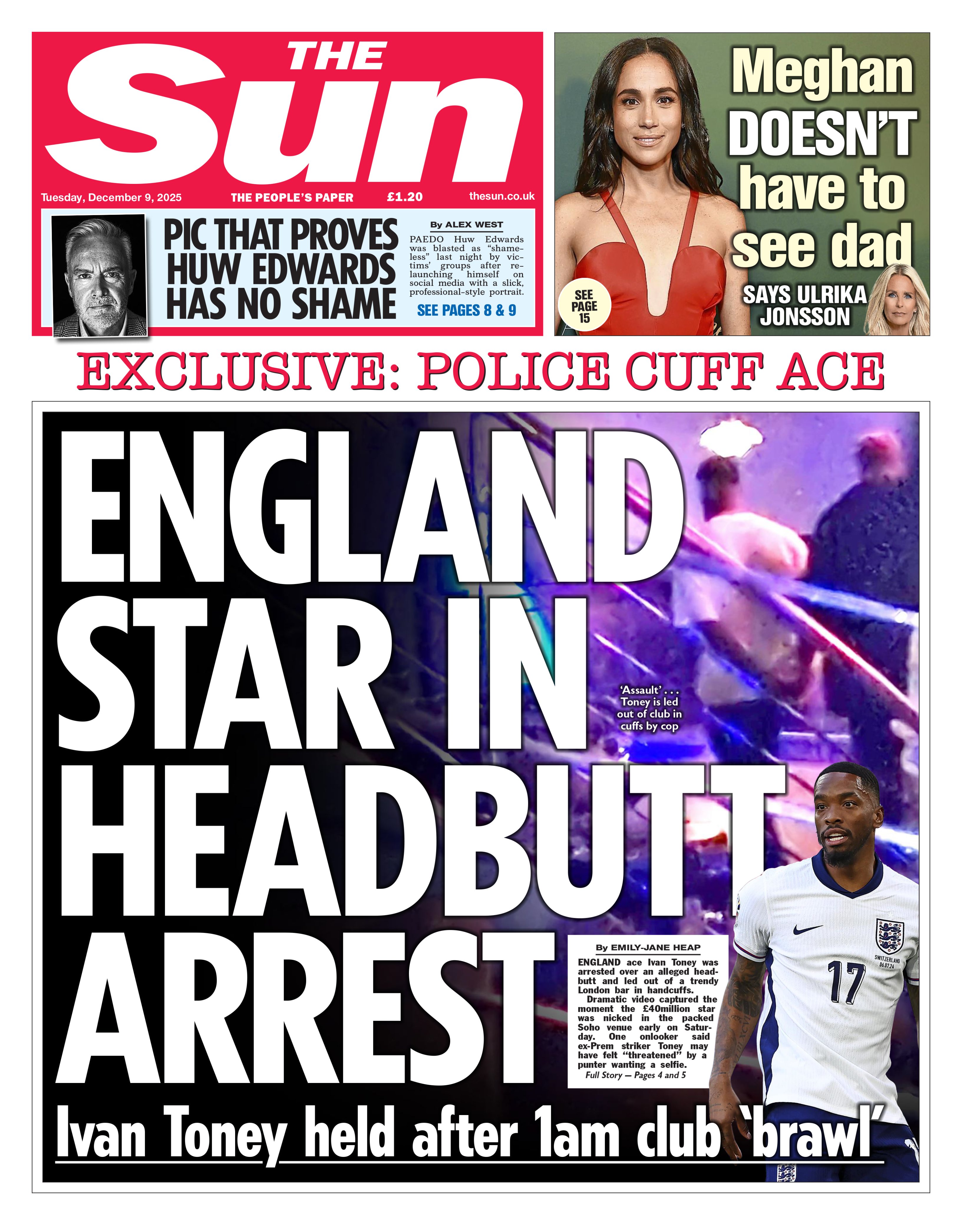 Bilder auf der Titelseite der heutigen Ausgabe der Boulevardzeitung zeigen, wie der siebenfache Nationalspieler von Polizeikräften abgeführt wird. Auslöser war offenbar ein übergriffiger Fan, der ein Selfie wollte und sein Vorhaben sehr offensiv umzusetzen versuchte. Ein Zeuge wird von der ‚Sun‘ wie folgt zitiert: „Einer von ihnen erkannte ihn und sagte: ‚Oh, das ist Ivan Toney‘ und versuchte, ihm die Hände um den Hals zu legen, um ein Foto mit ihm zu machen. […] Und dann sagte Toney: ‚Lass mich los, lass mich los!‘ und verpasste einem der Jungs einen Kopfstoß.“